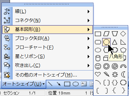 ①オートシェイプで八角形を描きます。